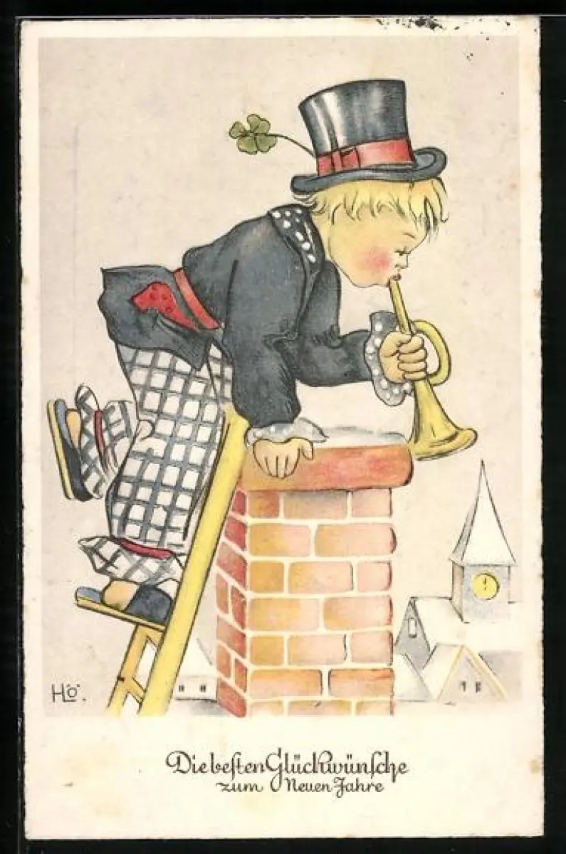 AK Schornsteinfeger mit Trompete auf dem Dach, Neujahrsgruss