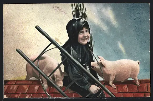 AK Schornsteinfeger mit zwei Glücksschweinchen auf dem Dach
