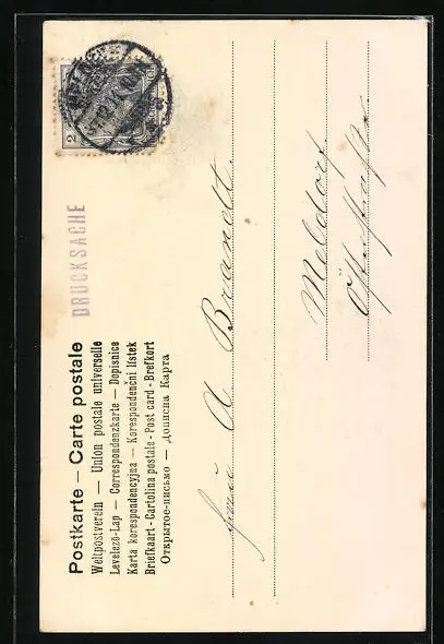 Personenbezogene Daten auf der Rückseite der Karte wurden durch blauen Textmarker unkenntlich gemacht. Die blauen Stellen sind auf die Vorderseite durchgeweicht und wirken sich negativ auf das Postkartenfoto aus