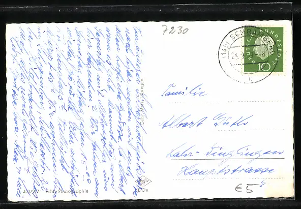 Personenbezogene Daten auf der Rückseite der Karte wurden durch blauen Textmarker unkenntlich gemacht. Die blauen Stellen sind auf die Vorderseite durchgeweicht und wirken sich negativ auf das Postkartenfoto aus