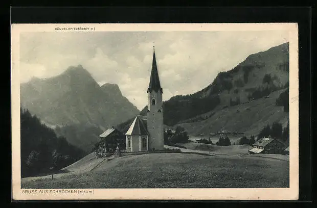 AK Schröcken i. Bregenzerwald, Teilansicht mit Kirche gegen Künzelspitze