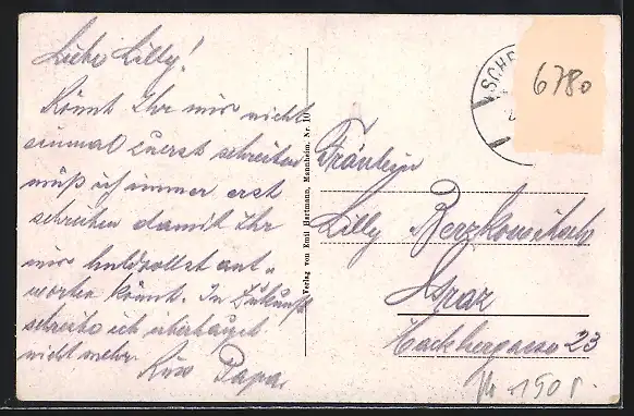 alte Ansichtskarte, gelaufen, Briefmarke entfernt, rückseitig Oberflächenschaden, guter Zustand