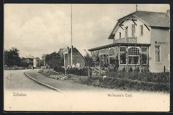 AK Schulau, Cafe Woltmann mit Strassenpartie