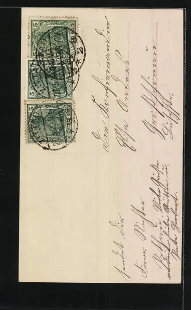 Personenbezogene Daten auf der Rückseite der Karte wurden durch blauen Textmarker unkenntlich gemacht. Die blauen Stellen sind auf die Vorderseite durchgeweicht und wirken sich negativ auf das Postkartenfoto aus