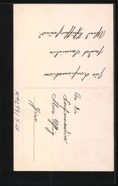 Personenbezogene Daten auf der Rückseite der Karte wurden durch blauen Textmarker unkenntlich gemacht. Die blauen Stellen sind auf die Vorderseite durchgeweicht und wirken sich negativ auf das Postkartenfoto aus