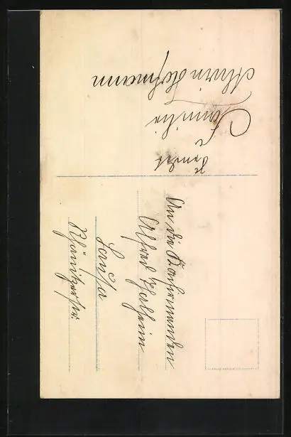 Personenbezogene Daten auf der Rückseite der Karte wurden durch blauen Textmarker unkenntlich gemacht. Die blauen Stellen sind auf die Vorderseite durchgeweicht und wirken sich negativ auf das Postkartenfoto aus