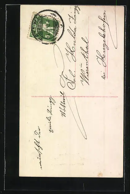 Personenbezogene Daten auf der Rückseite der Karte wurden durch blauen Textmarker unkenntlich gemacht. Die blauen Stellen sind auf die Vorderseite durchgeweicht und wirken sich negativ auf das Postkartenfoto aus