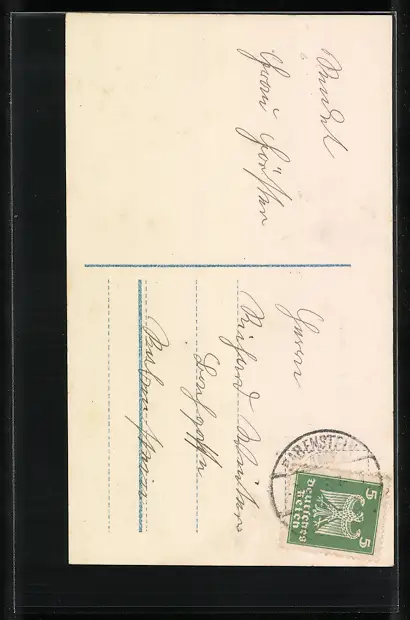 Personenbezogene Daten auf der Rückseite der Karte wurden durch blauen Textmarker unkenntlich gemacht. Die blauen Stellen sind auf die Vorderseite durchgeweicht und wirken sich negativ auf das Postkartenfoto aus