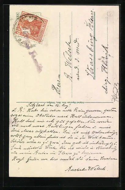 Personenbezogene Daten auf der Rückseite der Karte wurden durch blauen Textmarker unkenntlich gemacht. Die blauen Stellen sind auf die Vorderseite durchgeweicht und wirken sich negativ auf das Postkartenfoto aus