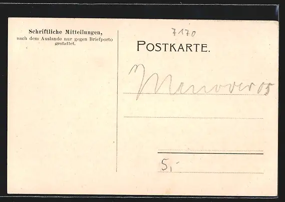 Personenbezogene Daten auf der Rückseite der Karte wurden durch blauen Textmarker unkenntlich gemacht. Die blauen Stellen sind auf die Vorderseite durchgeweicht und wirken sich negativ auf das Postkartenfoto aus