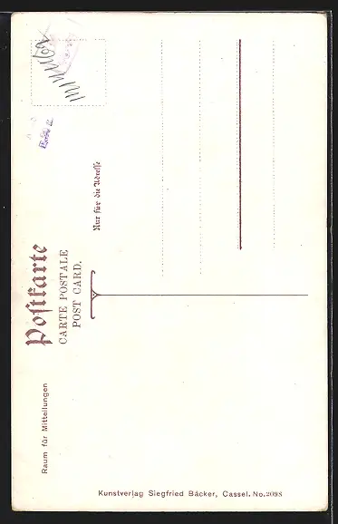 Personenbezogene Daten auf der Rückseite der Karte wurden durch blauen Textmarker unkenntlich gemacht. Die blauen Stellen sind auf die Vorderseite durchgeweicht und wirken sich negativ auf das Postkartenfoto aus