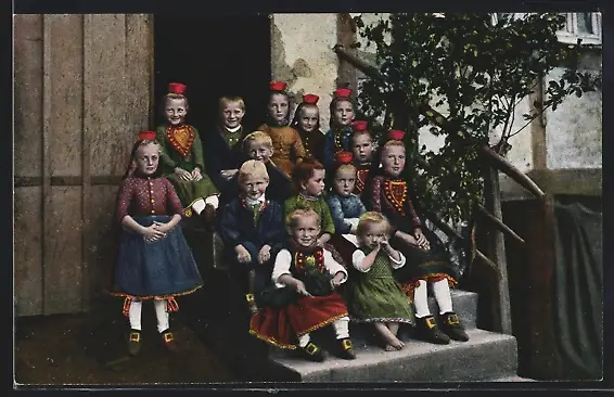 AK Schwälmer Kinder auf der Treppe in hessischer Tracht
