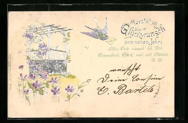 AK Schwalbe mit Brief zu Neujahr