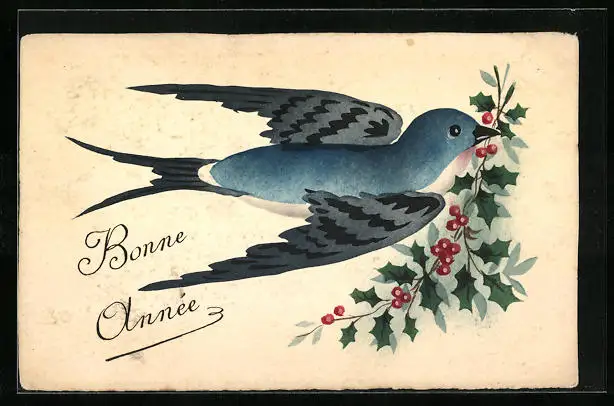 AK Schwalbe mit Ilexzweig im Schnabel, Neujahrsgruss