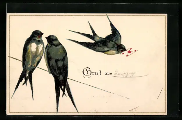 AK Schwalbenpaar und Briefschwalbe mit Liebesbrief