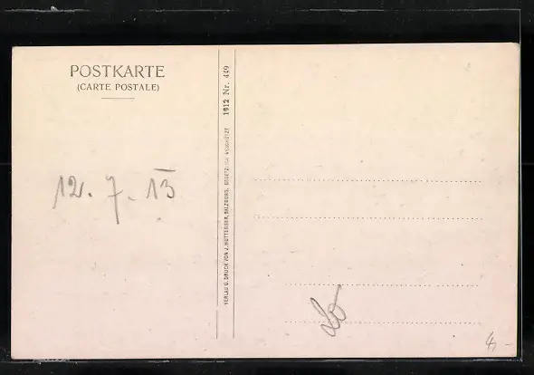 Personenbezogene Daten auf der Rückseite der Karte wurden durch blauen Textmarker unkenntlich gemacht. Die blauen Stellen sind auf die Vorderseite durchgeweicht und wirken sich negativ auf das Postkartenfoto aus
