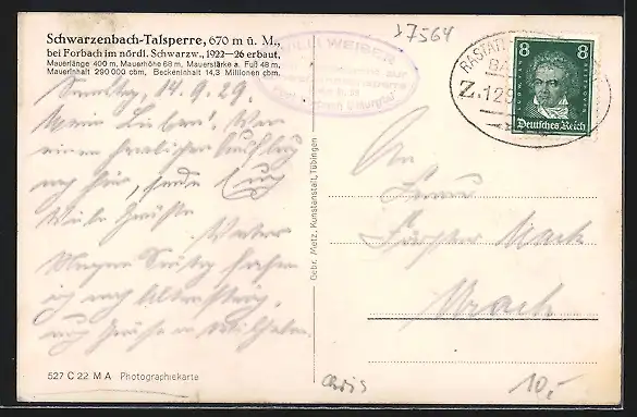 Personenbezogene Daten auf der Rückseite der Karte wurden durch blauen Textmarker unkenntlich gemacht. Die blauen Stellen sind auf die Vorderseite durchgeweicht und wirken sich negativ auf das Postkartenfoto aus