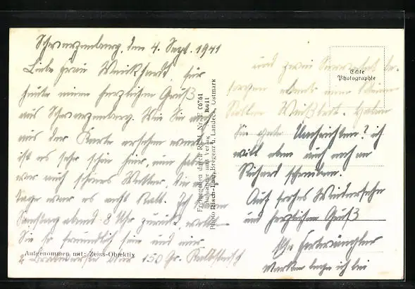 Personenbezogene Daten auf der Rückseite der Karte wurden durch blauen Textmarker unkenntlich gemacht. Die blauen Stellen sind auf die Vorderseite durchgeweicht und wirken sich negativ auf das Postkartenfoto aus