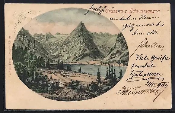 AK Schwarzensee, Ansicht vom Hang aus mit Bergen