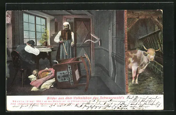 AK Schwarzwälder Tracht, das Schaukelbett ist umgekippt
