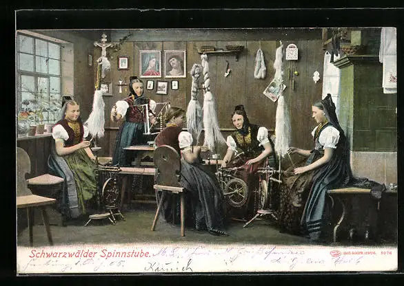 AK Schwarzwälderinnen in ihren Trachten in der Spinnstube