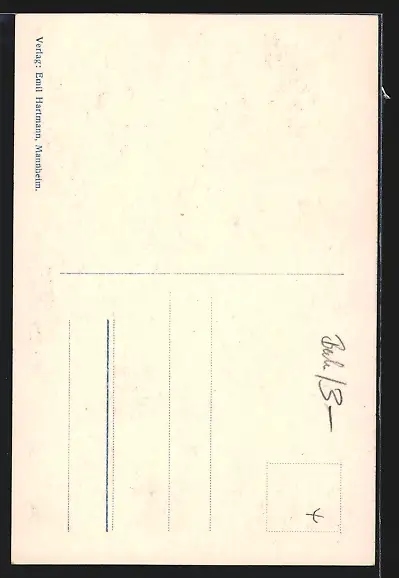 Personenbezogene Daten auf der Rückseite der Karte wurden durch blauen Textmarker unkenntlich gemacht. Die blauen Stellen sind auf die Vorderseite durchgeweicht und wirken sich negativ auf das Postkartenfoto aus