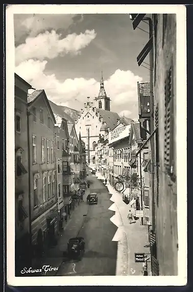 AK Schwaz /Tirol, Gasthof zum blauen Haus mit Strassenpartie