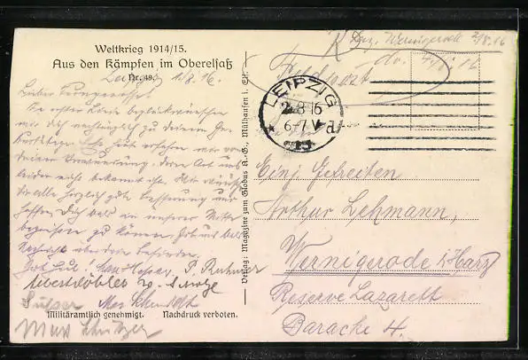 alte Ansichtskarte, gelaufen als Feldpost 1916, re. oben Ecke beschnitten, guter Zustand