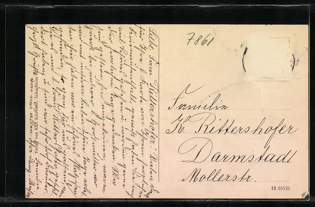 Personenbezogene Daten auf der Rückseite der Karte wurden durch blauen Textmarker unkenntlich gemacht. Die blauen Stellen sind auf die Vorderseite durchgeweicht und wirken sich negativ auf das Postkartenfoto aus