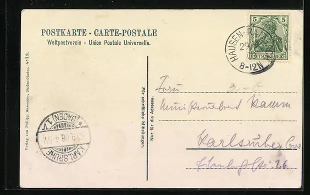 Personenbezogene Daten auf der Rückseite der Karte wurden durch blauen Textmarker unkenntlich gemacht. Die blauen Stellen sind auf die Vorderseite durchgeweicht und wirken sich negativ auf das Postkartenfoto aus