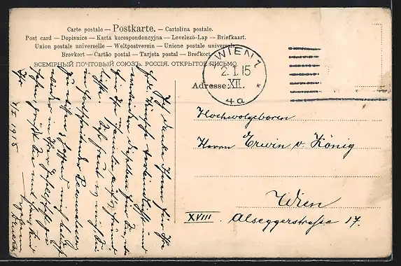 alte Ansichtskarte, gelaufen 1915, Briefmarke entfernt, rückseitig Oberflächenschaden, Stempelspur, guter Zustand