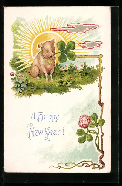 AK Schwein mit Glücksklee im Rüssel, Jugendstil