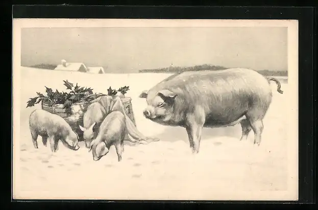 AK Schwein und Ferkel mit einer Kiste im Schnee