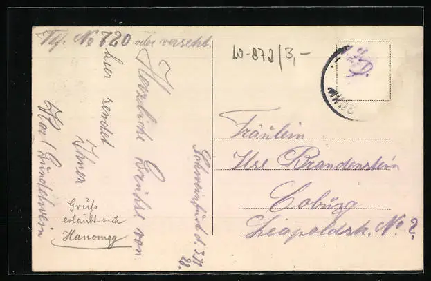 Personenbezogene Daten auf der Rückseite der Karte wurden durch blauen Textmarker unkenntlich gemacht. Die blauen Stellen sind auf die Vorderseite durchgeweicht und wirken sich negativ auf das Postkartenfoto aus