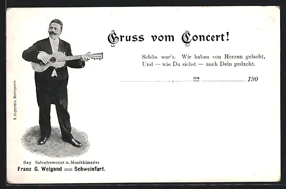 AK Schweinfurt, Musiker und Humorist Franz G. Weigand mit Gitarre, Gruss vom Concert