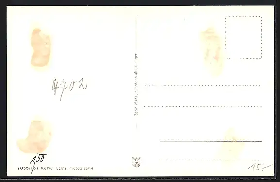 Personenbezogene Daten auf der Rückseite der Karte wurden durch blauen Textmarker unkenntlich gemacht. Die blauen Stellen sind auf die Vorderseite durchgeweicht und wirken sich negativ auf das Postkartenfoto aus