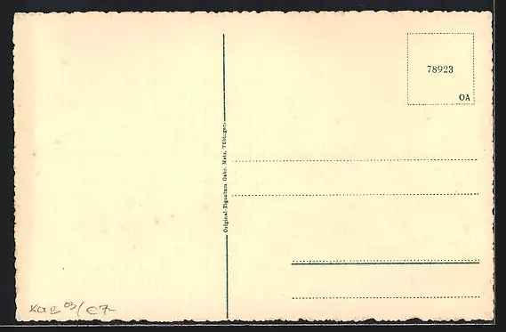 Personenbezogene Daten auf der Rückseite der Karte wurden durch blauen Textmarker unkenntlich gemacht. Die blauen Stellen sind auf die Vorderseite durchgeweicht und wirken sich negativ auf das Postkartenfoto aus