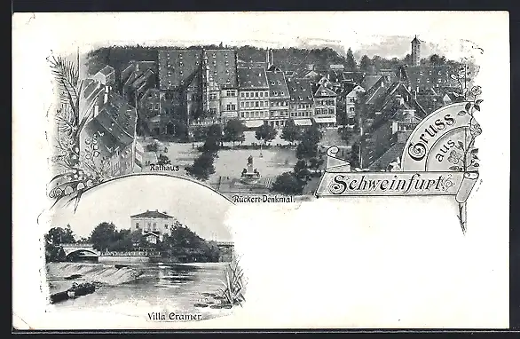 AK Schweinfurt, Rathaus, Villa Cramer und Rückert-Denkmal