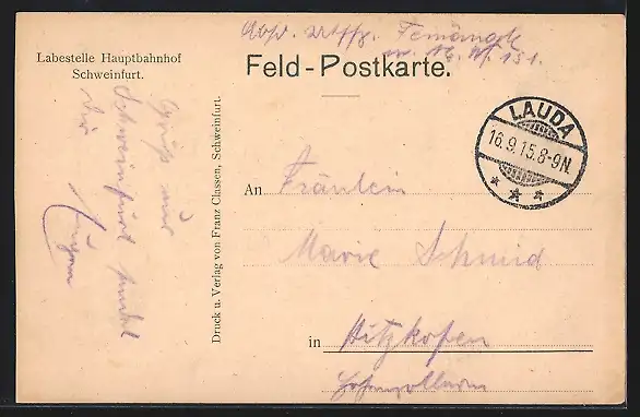 Personenbezogene Daten auf der Rückseite der Karte wurden durch blauen Textmarker unkenntlich gemacht. Die blauen Stellen sind auf die Vorderseite durchgeweicht und wirken sich negativ auf das Postkartenfoto aus