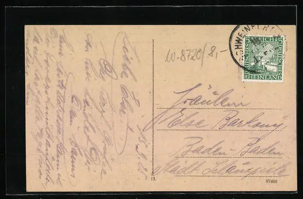 Personenbezogene Daten auf der Rückseite der Karte wurden durch blauen Textmarker unkenntlich gemacht. Die blauen Stellen sind auf die Vorderseite durchgeweicht und wirken sich negativ auf das Postkartenfoto aus