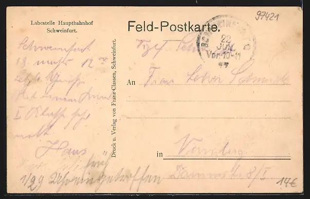 Personenbezogene Daten auf der Rückseite der Karte wurden durch blauen Textmarker unkenntlich gemacht. Die blauen Stellen sind auf die Vorderseite durchgeweicht und wirken sich negativ auf das Postkartenfoto aus