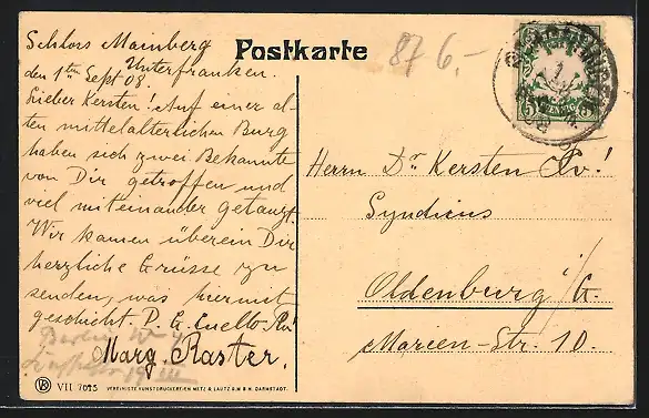 alte Ansichtskarte, gelaufen 1908, Eckknick li. oben, guter Zustand