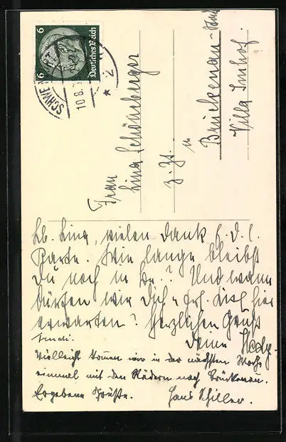 Personenbezogene Daten auf der Rückseite der Karte wurden durch blauen Textmarker unkenntlich gemacht. Die blauen Stellen sind auf die Vorderseite durchgeweicht und wirken sich negativ auf das Postkartenfoto aus