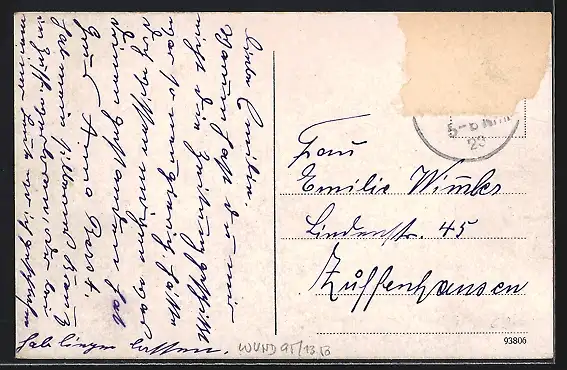 Personenbezogene Daten auf der Rückseite der Karte wurden durch blauen Textmarker unkenntlich gemacht. Die blauen Stellen sind auf die Vorderseite durchgeweicht und wirken sich negativ auf das Postkartenfoto aus