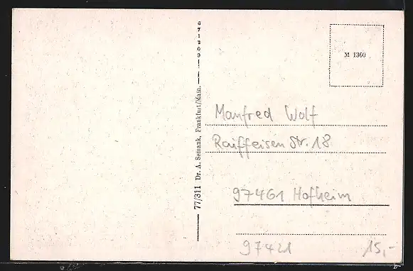 Personenbezogene Daten auf der Rückseite der Karte wurden durch blauen Textmarker unkenntlich gemacht. Die blauen Stellen sind auf die Vorderseite durchgeweicht und wirken sich negativ auf das Postkartenfoto aus