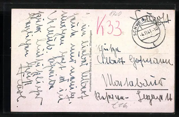 Personenbezogene Daten auf der Rückseite der Karte wurden durch blauen Textmarker unkenntlich gemacht. Die blauen Stellen sind auf die Vorderseite durchgeweicht und wirken sich negativ auf das Postkartenfoto aus