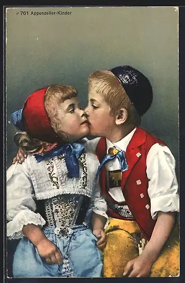 AK Schweiz, Appenzeller Kinder in Tracht küssen sich