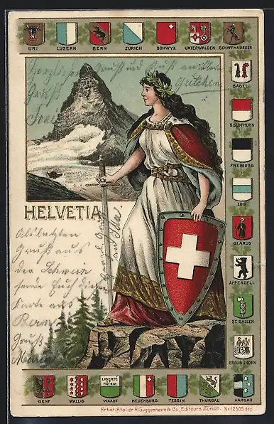 AK Schweiz, Helvetia, Wappen der Kantone, Matterhorn