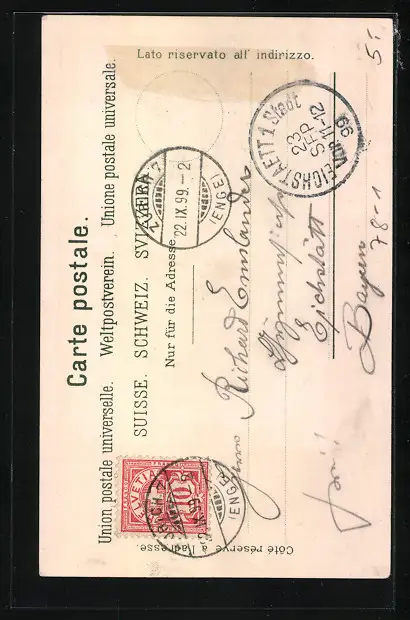 gelaufen 1899, rückseitig Klebe- und Papierreste, guter Zustand