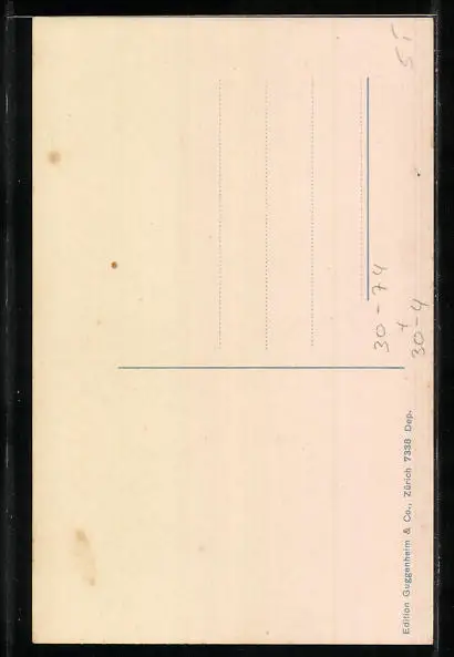 Personenbezogene Daten auf der Rückseite der Karte wurden durch blauen Textmarker unkenntlich gemacht. Die blauen Stellen sind auf die Vorderseite durchgeweicht und wirken sich negativ auf das Postkartenfoto aus